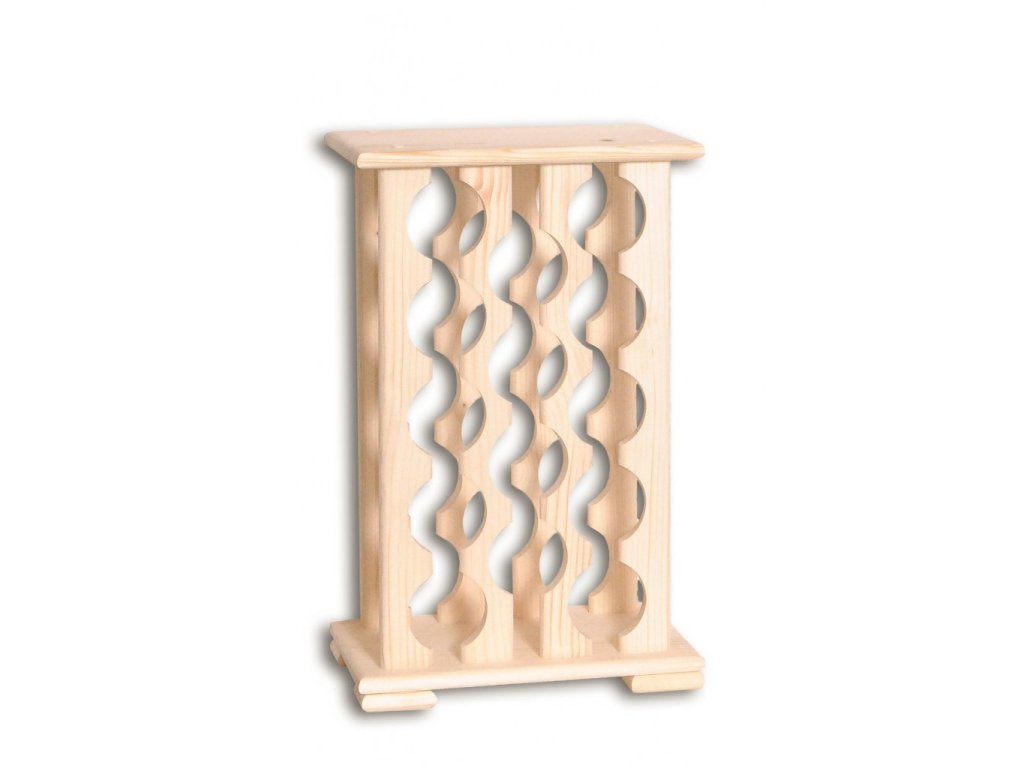 Regał (stojak) na wino jest wykonany z drewna świerkowego, ma naturalny wygląd, bez lakierowania. Te oto regały na wino są wyprodukowane dla zwykłych rodzajów butelek o średnicy 74 aż 76 mm, wysokości od 290 do 320 mm i objętości 0,7 aż 0,75 l.