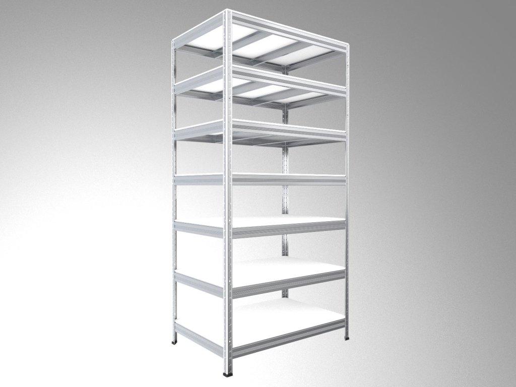 Regał bezśrubowy (wciskany) Biedrax 35 x 120 x 210 cm, ocynk, 7 półek białych laminowanych 12mm, nośność 200 kg na półkę