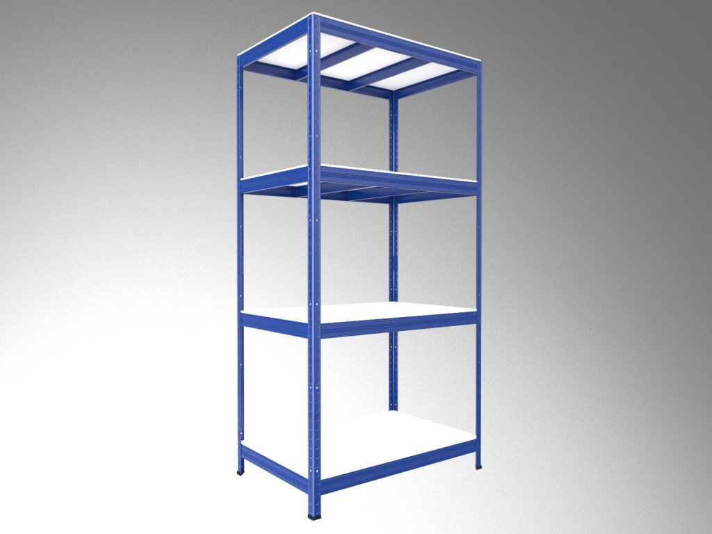 Regał bezśrubowy (wciskany) Biedrax 35 x 75 x 180 cm, niebieski, 4 półki białe laminowane 12mm, nośność 300 kg na półkę