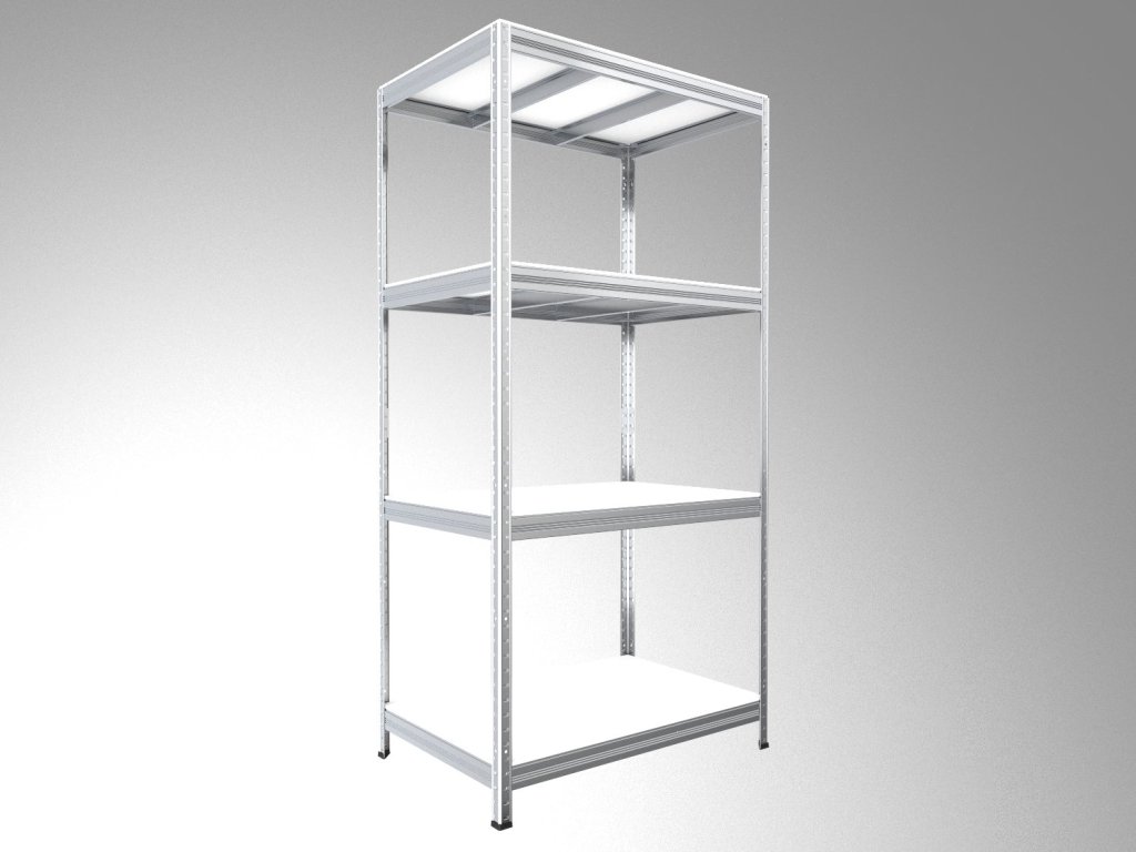 Regał bezśrubowy (wciskany) Biedrax 35 x 75 x 180 cm, ocynk, 4 półki białe laminowane 12mm, nośność 300 kg na półkę