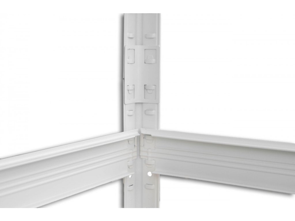 Regały metalowe z białymi półkami z laminowanej płyty wiórowej 12 mm, krawędzie ABS z wszystkich stron. Półki regału są odporniejsze przeciw wilgotności. Regały można utrzymywać wilgotną szmatą i na końcu półki osuszyć. Prosty i szybki system montażu, wsuniesz belki do słupków i lekkimi stuknięciami młotkiem dotrzasną się do końca. Wysoka stabilność regału, szybkość montażu - bez śrub! Regały metalowe można umieścić w spiżarni, komorze, piwnicy.