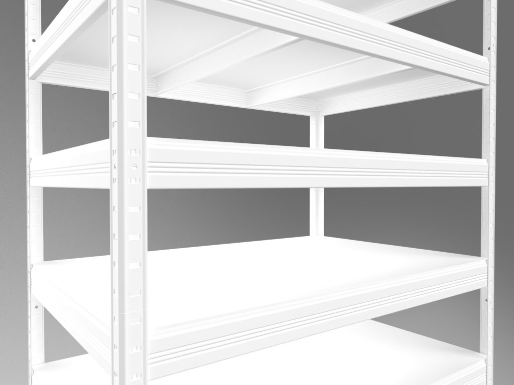Regał do piwnicy z półkami z białej płyty wiórowej laminowanej o grubości 12 mm, wykończonymi ze wszystkich stron krawędzią ABS. Dzięki temu półki są bardziej odporne na wilgoć i łatwe w utrzymaniu – wystarczy przetrzeć je wilgotną szmatką, a następnie wytrzeć do sucha. Montaż jest szybki i prosty dzięki systemowi bezśrubowemu, co gwarantuje wysoką stabilność.