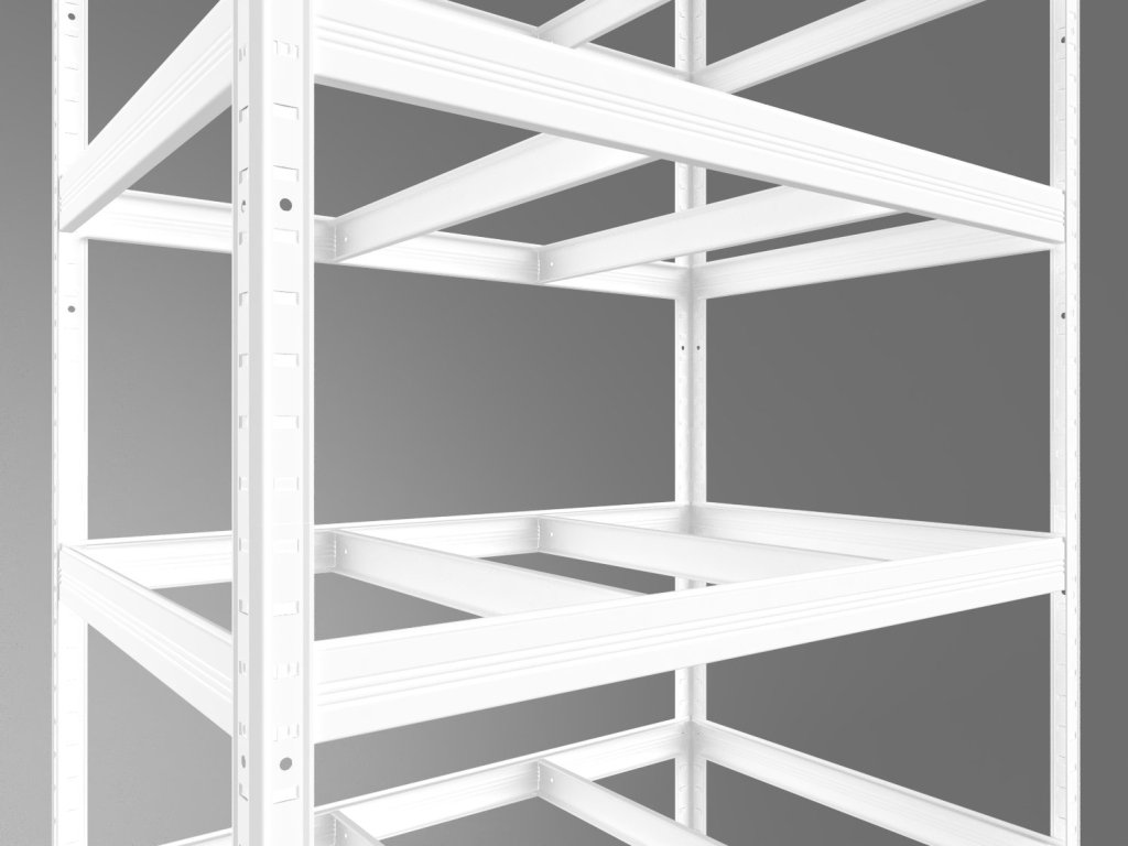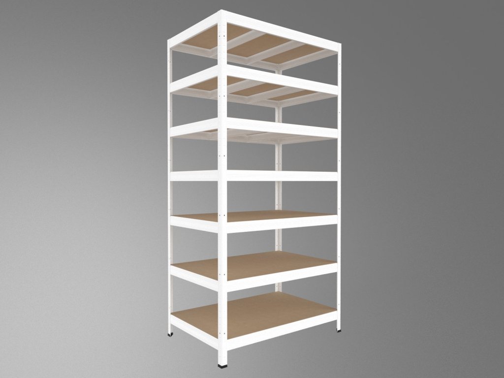 Regał gospodarczy z ekologicznymi półkami z płyt MDF, produkowanymi pod wysokim ciśnieniem bez dodatku klejów. System bezśrubowy (wciskany) zapewnia wyjątkową stabilność oraz błyskawiczny montaż – belki wystarczy wsunąć w słupki i zabezpieczyć lekkim uderzeniem. Brak śrub gwarantuje maksymalną sztywność konstrukcji. Uwaga: Półki MDF nadają się wyłącznie do suchych pomieszczeń.
