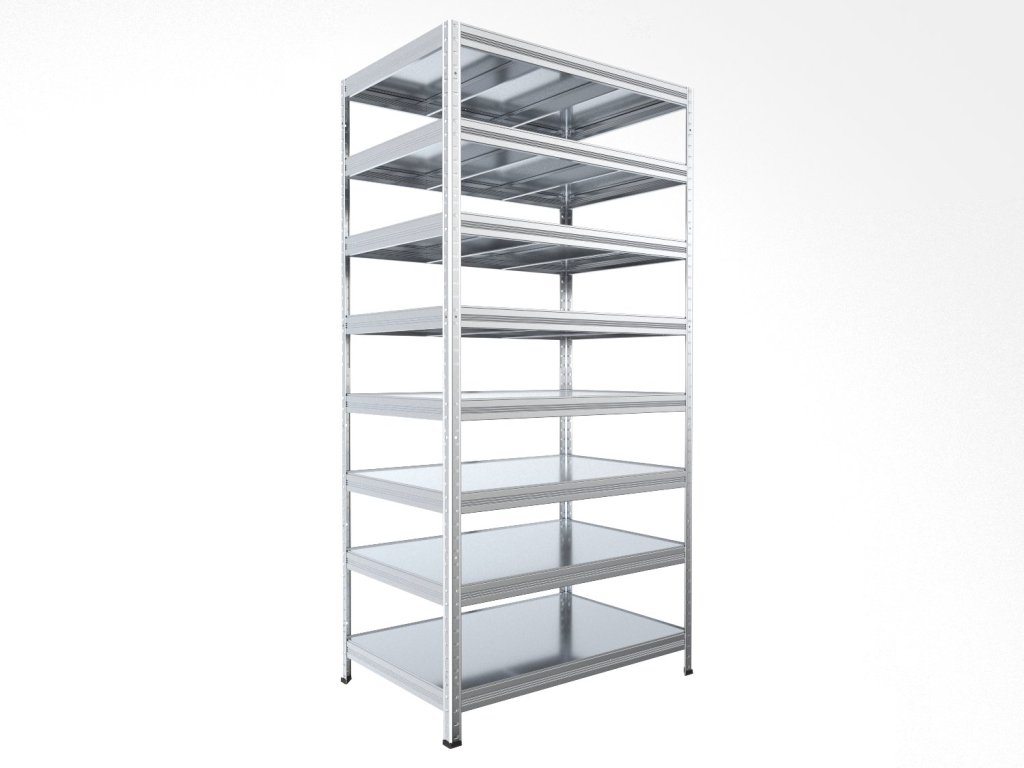 Regał metalowy z półkami z blachy ocynkowanej, które są trwałe, zmywalne i nadają się również do wilgotnych środowisk, takich jak piwnice, garaże czy szklarnie. Unikalny system bezśrubowy gwarantuje szybki montaż i wysoką stabilność. Półki są dodatkowo sprytnie osadzone w belkach, tworząc praktyczną 4-milimetrową krawędź, która zapobiega wypadaniu przechowywanych przedmiotów.