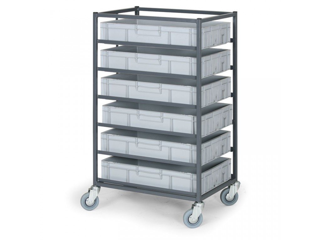konstrukcja wyprodukowana jest z rur i profilów stalowych, gumowe kółka z średnicą 100 mm z igiełkowymi łożyskami. Dla standardowych skrzynek rozmiar 600 x 400 mm, skrzynki nie są częścią produktu.