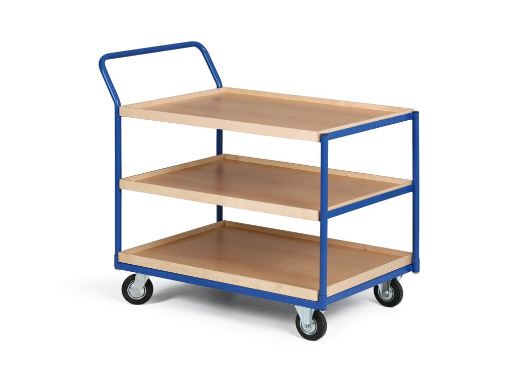 Półki z płyty wiórowej z krawędzią ze sklejki, która zapobiega wysunięciu się materiału z wózka. Na zamówienie można koła dostarczyć z hamulcem przeciw poruszaniu się wózka.
