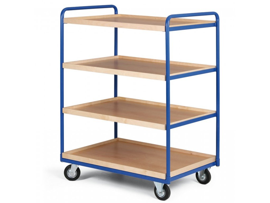 Półki z płyty wiórowej z krawędzią, która zapobiega wysunięciu się materiału z wózka. Na zamówienie można koła dostarczyć z hamulcem przeciw poruszaniu się wózka.