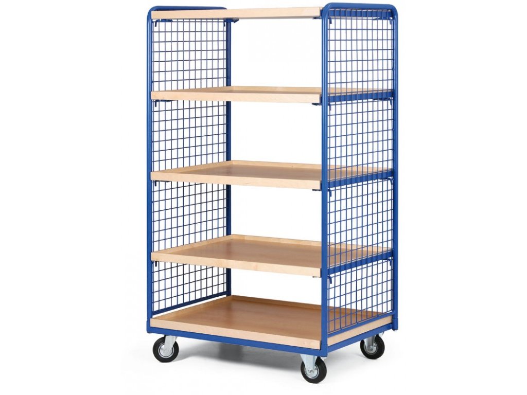 Półki z płyty wiórowej z krawędzią, która zapobiega wysunięciu się materiału z wózka. Na zamówienie można koła dostarczyć z hamulcem przeciw poruszaniu się wózka.