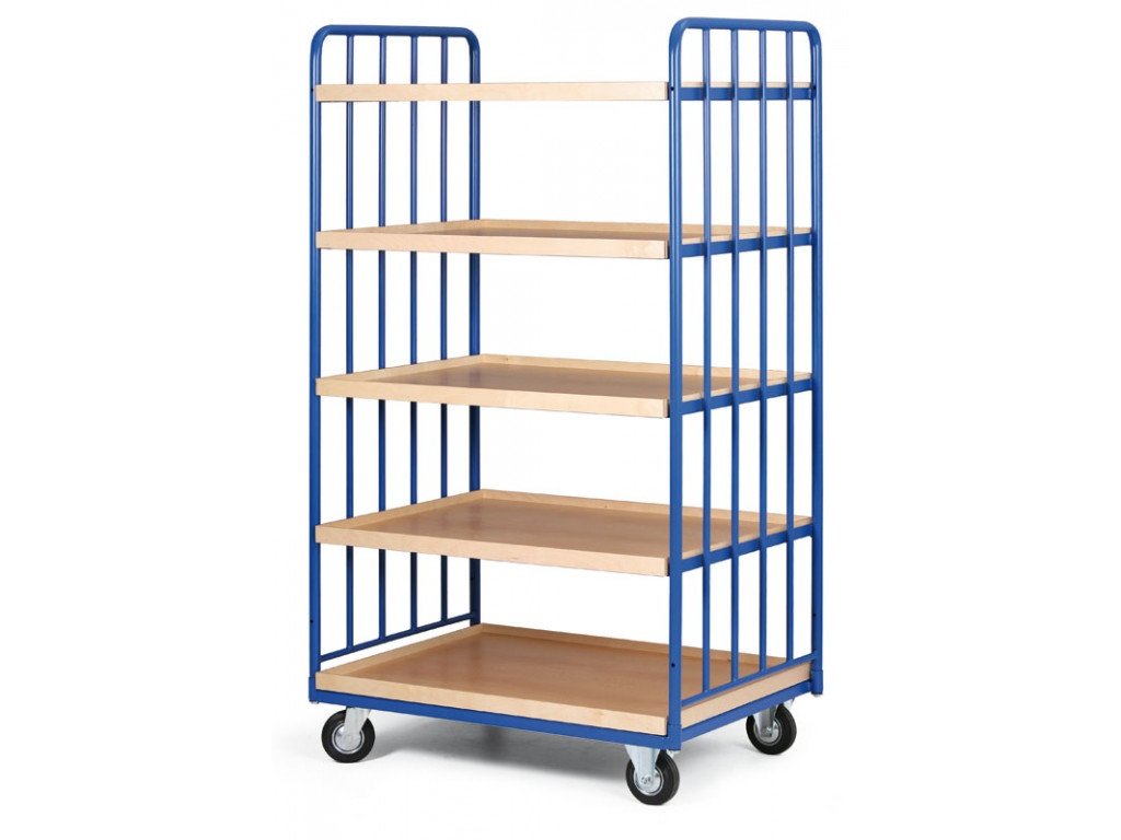 Półki z płyty wiórowej z krawędzią, która zapobiega wysunięciu się materiału z wózka. Na zamówienie można koła dostarczyć z hamulcem przeciw poruszaniu się wózka.