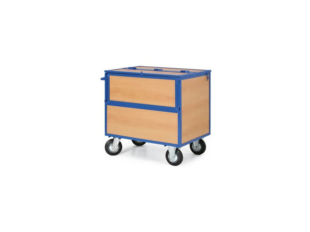 Spawana konstrukcja zapewnia stabilność. Przednią ścianę można uchylić, by móc łatwiej z ładunkiem manipulować. Górna pokrywa jest na zawiasach obrotowych i blokuje się za pomocą kłódki, która nie jest częścią paczki. Dno jest z laminowanej płyty wiórowej.